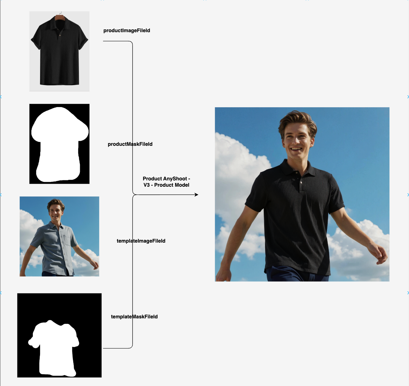 - Use product image, product mask image, model image, and model mask image to create a composite result image.
